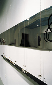 Es pensa i prepara la mostra per que s'hi pugui actuar. Les peces estan pejades de fines cadenes omplint l'espai. |